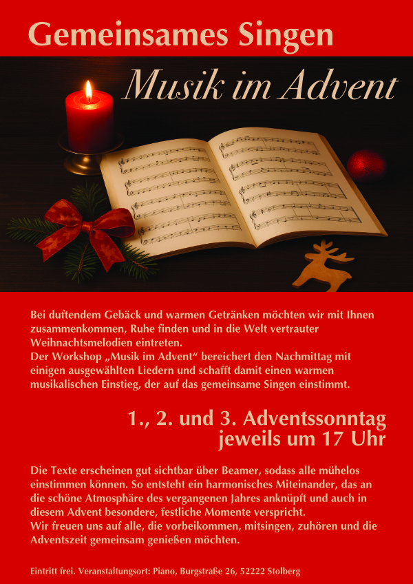 Kommt vorbei, genießt die Musik und die gemütliche Adventsstimmung bei Kaffee und Gebäck im Rahmen des Weihnachtsmarktes in der Stolberger Altstadt. Wir freuen uns auf zahlreiche Zuhörer!